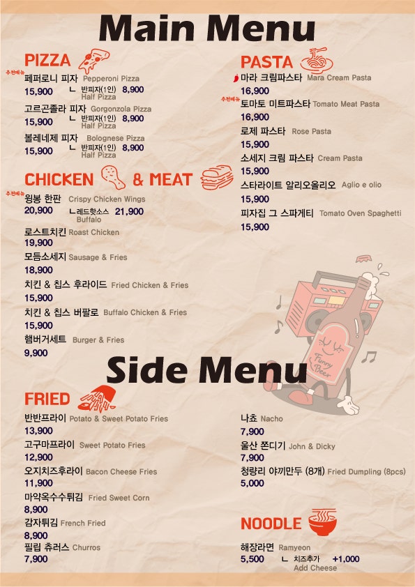 - 반반 프라이: 오리지널 + 칠리 두 가지 맛