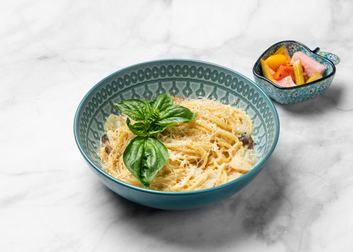 진한 우유와 크림, 새우와 베이컨이 부드럽게 녹아든 맛