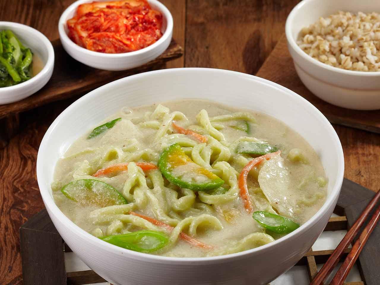 들깨의 고소함이 진하게 느껴지는 국물! 건강하고 포근한 맛이에요. 고소한 국물과 쫄깃한 녹색 면이 환상의 조합이에요.