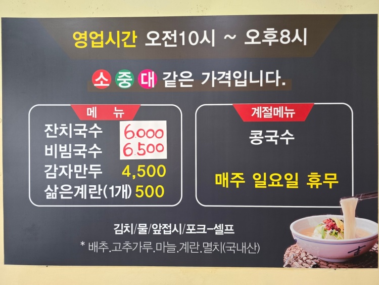 | 삶은계란 (1개) | 500원 | 비빔국수의 완성도를 높이는 필수 사이드 |
