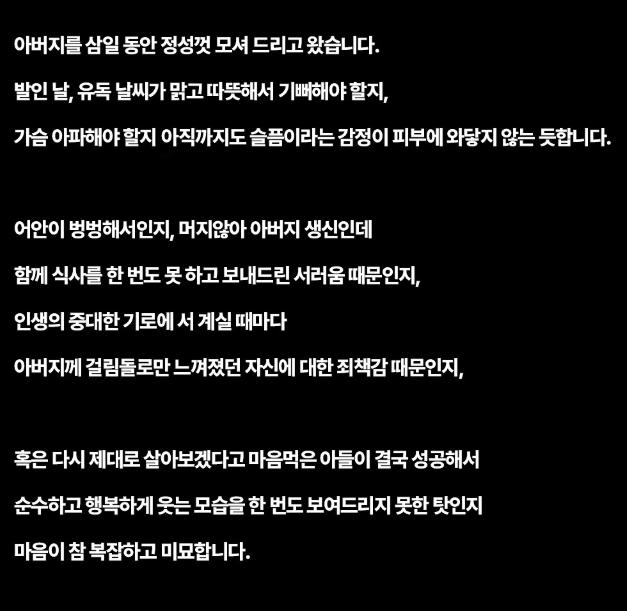 - 아버지의 하관 후에야 영정 속 미소를 마주하고 제대로 이별할 수 있었다고 전함.