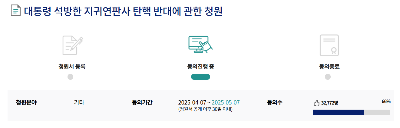 지귀연 판사 탄핵 반대 청원이 진행 중이며,
