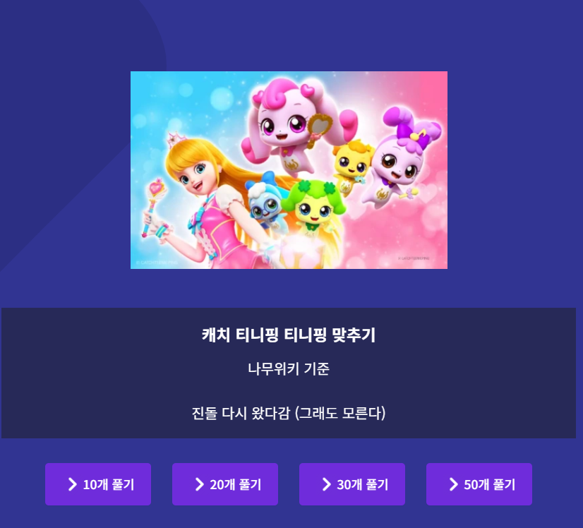 또한, 티니핑 이름 맞추기는 100종이 넘는 다양한 티니핑 캐릭터의 이름을 추측하는 콘텐츠로 많은 인기를 끌고 있습니다.