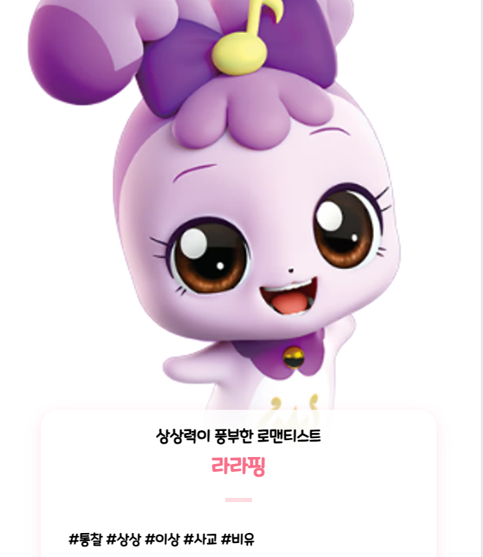특히 저는 '라라핑'으로 결과가 나왔는데, 이 캐릭터는 창의적이고 상상력이 풍부한 성격을 가지고 있다고 해요.