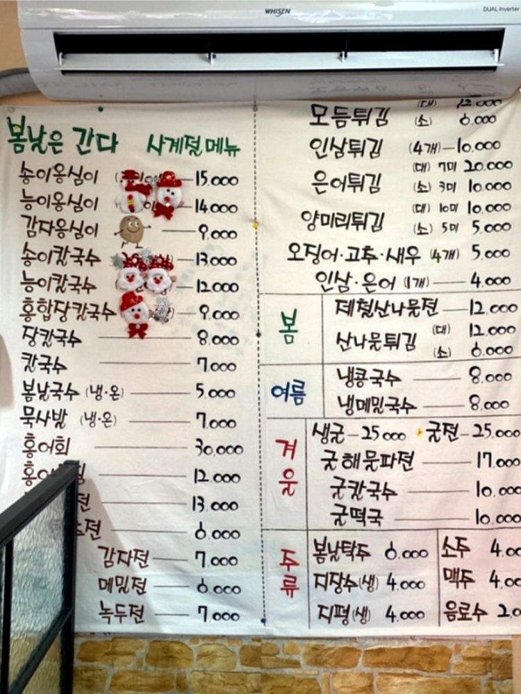 | 칼국수 / 봄날국수 | 7,000원 / 5,000원 | 기본 국수류 |